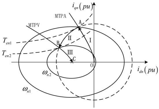 According to the definition of the MTPA line and MTPV line, their expressions of can be obtained by the equal slope method. From (10), the tangent slope on the equal torque curve is: