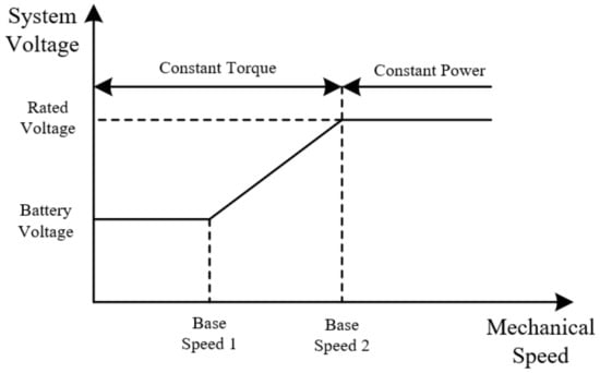 According to (8) and (9), the back electromotive force of PMSM is proportional to the motor speed, so the minimum bus voltage required to maintain the current speed stability of the motor can be calculated by (8) and (9). As shown in Figure 2, when the rotational speed is lower than , the input voltage of the inverter is the battery voltage ; when the speed is above the base speed , the input voltage of the inverter is adjusted with the motor speed; when the rotational speed is higher than , the input voltage of the inverter is . Therefore, the input voltage of the inverter can be expressed as a piecewise continuous function varying with speed.