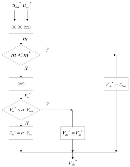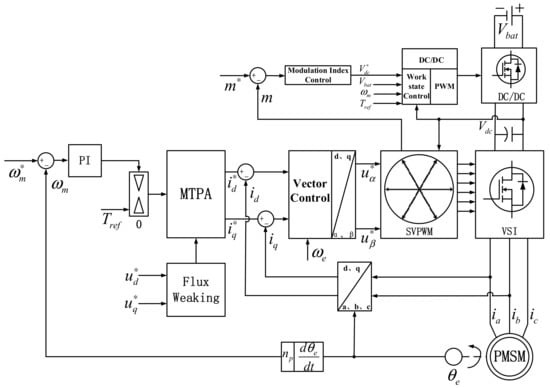 To realize the optimal control of the PMSM drive system with bidirectional DC/DC integration, many scholars and experts began to devote themselves to this research. In [] researchers adopted the method of adjusting the bus voltage of the motor according to the speed of the motor, which enabled the DC/DC converter to adjust the bus voltage in time according to the operating conditions of the motor, and improved the voltage utilization rate, but the system parameters were easily affected, and the dynamic performance of the system was poor. In [] researchers adopted the voltage disturbance state filter (VDSF) to estimate the calculation error of DC bus voltage caused by parameter errors and spatial harmonic effects, which improved the stability of voltage instruction and ensured the calculation accuracy of the minimum bus voltage of the motor in a steady-state but did not consider the fluctuation of DC bus voltage. In [] researchers adopted a boost strategy combining active thermal management with dynamic link voltage adaptation, which ensured the reliability of the drive system but did not consider the voltage safety margin in the weak magnetic region, which could not guarantee the dynamic performance of the motor when the working conditions changed. In [] researchers adopted the method of calculating the required minimum DC bus voltage in real-time according to the mathematical relationship between DC bus voltage and back electromotive force and compared it with the current bus voltage. When the required minimum bus voltage command value is close to the DC bus voltage value, the DC bus voltage is increased by an appropriate voltage value, which avoids the fluctuation of DC bus voltage value to some extent and improves the dynamic performance of the motor, but the selection of voltage value depends on engineering experience. Therefore, the bus voltage adjustment should consider the minimum bus voltage required by the motor drive system and ensure the dynamic performance of the motor.