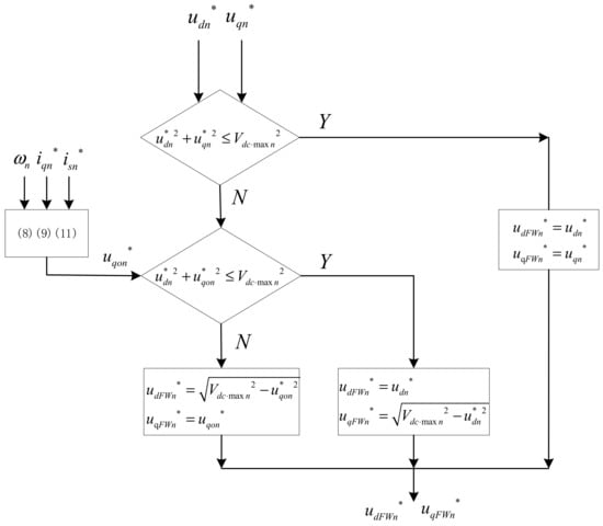 From the analysis in Section 2.2, it can be concluded that when the motor speed is lower than the base speed , the working point of the motor is on the MTPA. When the speed is higher than the , in order to continue to rise, weak magnetic control must be used. In the weak magnetic region, the voltage vector amplitude is close to the output voltage limit of the inverter. In the transient process, the output voltage instruction of the current loop sometimes exceeds the output voltage limit of the inverter due to external interference and other factors. At this time, the d-q current loops are saturated and highly coupled, which affects the current following ability of the control loop, resulting in the increase of current harmonics and the imbalance of current. If serious, it will cause the system to shut down.