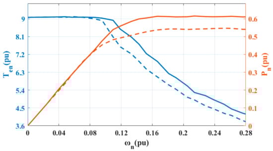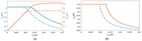 Figure 7 shows the external characteristic simulation of PMSM with traditional topology and bidirectional DC/DC topology. As shown in Figure 7a, under the traditional motor topology, p.u. begins to enter the weak magnetic region from the base velocity region. The output power of the constant power region is 0.54p.u. After the bidirectional DC/DC topology is added, p.u. enters the weak magnetic area, and the output power of the constant power region is 0.62p.u. The simulation results show that adding bidirectional DC/DC can expand the constant torque region of the motor, improve the output power of the motor in the constant power region and improve the driving performance of the motor. As shown in Figure 7b, at the same speed in the weak magnetic area, the bidirectional DC/DC topology has a smaller negative id current, which reduces the copper loss of the motor. At the same time, the motor can obtain a higher speed without running in the deep weak magnetic region, which ensures a wide speed range.
