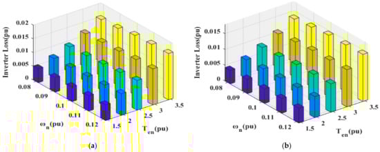 Figure 8 shows the inverter loss simulation of the traditional boost algorithm with bidirectional DC/DC topology and the proposed SVPWM boost algorithm. As shown in Figure 8a, under the traditional boost algorithm, the inverter loss is 0.015p.u. when the motor fundamental speed region p.u., p.u. and the inverter loss is 0.0155p.u. when the boost region p.u., p.u. As shown in Figure 8b, under the same motor working condition under the boost algorithm, the inverter losses are 0.014p.u. and 0.015p.u. The simulation results show that the boost algorithm reduces the inverter loss in the fundamental speed region and the boost region, it ensures the efficient output of the inverter.