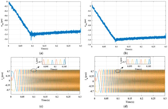 Figure 9 shows the simulation of the stator voltage d-axis component and three-phase current waveform before and after the voltage instruction compensation algorithm is added. As shown in Figure 9a, before the voltage command compensation, at 0.09 s it begins to enter the flux-weakening region from the base velocity region. At this time, the voltage spike of 0.2p.u. appears in the d-axis component of the stator voltage, resulting in the unbalanced three-phase current, as shown in Figure 9c. In Figure 9b, adding voltage instruction compensation, 0.09 s from the base speed region into the weak magnetic area, the stator voltage d axis component appears as a 0.02p.u. voltage spike, the three-phase current imbalance has been improved as shown in Figure 9d. The simulation results show that the voltage instruction compensation can effectively reduce the three-phase current imbalance when the motor enters the weak magnetic region from the base speed area and ensures the smooth operation of the motor.