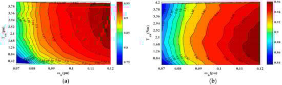 Figure 12 shows the inverter efficiency MAP experimental results of the traditional algorithm and the fixed SVPWM modulation algorithm. As shown in Figure 12a, when the traditional algorithm p.u., p.u. the inverter efficiency in the base speed region is 88%, and when p.u., p.u. the inverter efficiency in the boost region is 93%, and the proportion of inverter efficiency greater than 95% reaches 12.5%. As shown in Figure 12b, under the same working conditions, the efficiency of the inverter in the base speed region of the fixed SVPWM modulation algorithm is 90%, and the efficiency in the boost region is 94%. The proportion of the inverter efficiency greater than 95% reaches 30.1%. The experimental results show that the efficiency of the inverter in the base speed region and the boost region is increased by 2% and 1%, respectively. The area of the efficient region of the inverter is expanded by nearly 17.5%, indicating that the proposed algorithm can obtain a higher and more stable efficient region, which verifies the correctness of the theoretical analysis and simulation.