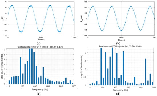 Figure 13 shows the experimental results of the phase A current waveform, and THD value before and after the voltage instruction compensation algorithm is added. as shown in Figure 13a,c, before adding voltage instruction compensation algorithm in the boost area p.u., p.u., the A-phase current waveform harmonic is larger and the waveform is unbalanced, and the THD value is 9.89%. As shown in Figure 13b,d, the harmonic and balance problems of the A-phase current waveform with the voltage instruction compensation algorithm under the same working conditions have been effectively improved, and the THD value is 5.34%. The experimental results show that the proposed algorithm can effectively reduce the current harmonics and improve the unbalanced current waveform, ensuring the control performance of the motor.