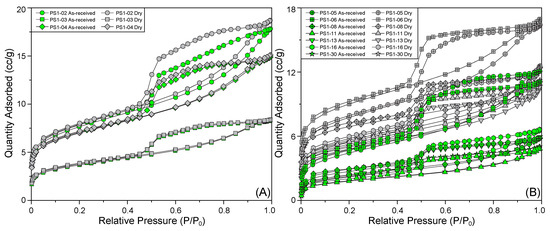 Low-pressure N2 adsorption isotherms of the as-received and dry shale samples from (A) the WF and (B) the LMX of the Well PS1.