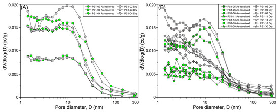 Pore size distribution calculated from the N2 adsorption isotherms of the as-received and dry shale samples from (A) the WF and (B) the LMX of the Well PS1.