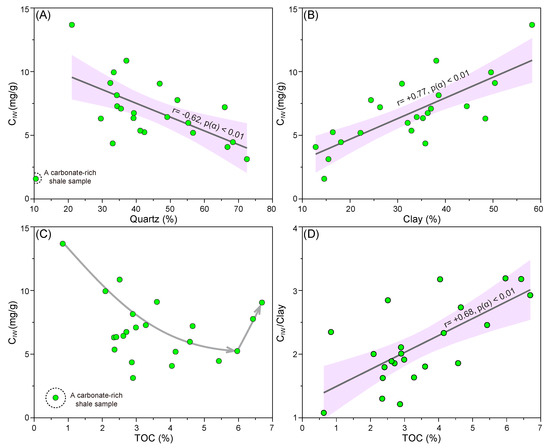 The OM-hosted pores are suggested to be hydrophobic and thus unfavorable for water absorption [17,22,46]. Water adsorption experiments also showed that the maximum quantity of adsorbed water content in kerogen is much less than that in clay minerals and shale samples [12]. The relationship between the CIW and TOC values of the studied WF–LMX shales seems to be complicated (Figure 7C). An overall decreasing trend can be observed with the TOC values increasing from 1 to 6%, while an increasing trend appears to be displayed in the TOC values greater than 6% (Figure 7C), probably pointing to the presence of irreducible water in organic pores. In order to explore the distribution of irreducible water in the OM, clay-normalized irreducible water content (i.e., CIW/clay ratio) was introduced in this study, which refers to the relative proportion of irreducible water in the OM. The CIW/clay ratios have a good positive correlation with the TOC values (Figure 7D; r = +0.68, p(α) < 0.01, n = 23), indicating that the irreducible water content could be increased with the increasing TOC. Thus, the relative content of irreducible water in organic pores appears to be greater in the organic-rich shales.