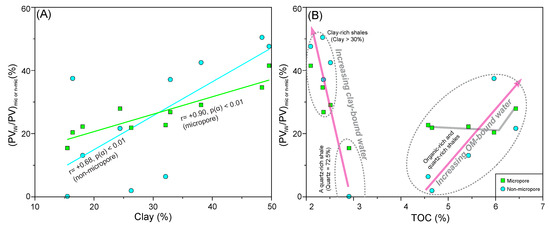 in which PVdry sample and PVas-received sample refer to the pore volume of an as-received and experimentally dried shale sample, respectively. The PVIW refers to the pore volume occupied by irreducible water, which can be calculated from the difference between PVdry sample and PVas-received sample. Since clay minerals and TOC are the most critical factors affecting the distribution of irreducible water in shale [12] (Figure 7B,C), the relationships between clay or TOC contents and the PVIW/PVdry sample ratios are displayed in Figure 9. As for the micropore, the (PVIW/PVdry sample)mic ratio displays an excellent positive relationship with the clay contents (r = +0.90, p(α) < 0.01, n = 10; Figure 9A), probably indicating that the irreducible water mainly occurs in the micropore of clay minerals. However, the (PVIW/PVdry sample)n-mic ratio has a moderate positive correlation with the clay contents (r = +0.68, p(α) < 0.01, n = 10; Figure 9A), implying that a considerable portion of irreducible water was also distributed in the non-micropores of clay minerals. A cross-plot between the PVIW/PVdry sample ratio and TOC content displays an overall similar trend for both micropore and non-micropore (Figure 9B). Within the TOC range of 2–3%, the PVIW/PVdry sample ratio shows an increasing trend with the decreasing TOC content, indicating the increasing clay-bound water in clay-rich shales (Figure 9B). The lowest PVIW/PVdry sample ratio was displayed in a shale sample having maximum quartz content (72.5%), which may be linked to poor adsorption capability for water molecules [47]. With the increasing TOC content (>4.5%), the (PVIW/PVdry sample)n-mic ratio displays an increasing trend in the organic-rich siliceous shale samples (Figure 9B), while the (PVIW/PVdry sample)mic ratio does not follow such an increasing trend, probably implying that an increasing OM-bound water occurs in the non-micropores rather than in the micropores.