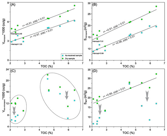 Recent studies have shown that irreducible water could exert an important effect on the pore structure of shale reservoirs, e.g., the reduction in pore volume and specific surface area (e.g., [15,28]). In our study, the Vmic values have an excellent positive correlation with the TOC contents of both as-received and dry shale samples (Figure 10A). Moreover, the Smic values also display such a linear relationship with the TOC contents for both (Figure 10B). These results show that the micropores were mainly developed in the OM, and the irreducible water was evenly distributed in the clay-hosted pores. The pore volume and specific surface area difference of the intercepts between as-received and dry shale samples should be mainly contributed from the water occupying in the clay-hosted pores (Figure 9A), e.g., 1.14 × 10−3 cc/g and 4.17 m2/g, respectively. As for the non-micropores, the reduction extent of Vn-mic values between as-received and dry shale samples significantly varies, which displays relatively high values (37.1–50.5%) for the low-TOC shales but exhibits relatively low and varied values (6.4–37.5%) for the high-TOC shales (Figure 10C), implying that irreducible water has more negative effects on the volume of non-micropores in the low-TOC shale relative to the high-TOC shale. The SBET values have a good positive correlation with the TOC values (Figure 10D), indicating that the specific surface area of non-micropores was chiefly contributed by organic pores. Although the reduction extent of SBET values between as-received and dry shale samples also significantly varies (Figure 10D), the effect of irreducible water on the SBET values was more significant than the Vn-mic values, especially for high-TOC shale samples.