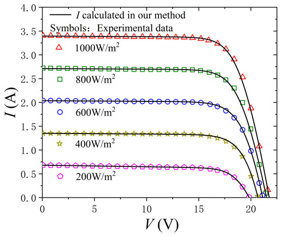 There are various methods [7,8,9,10,11,12,13,14,15,16,17,18,19] for extracting the parameters of single-diode model. These methods are usually divided into two categories. The procedure of the first category [7,8,9,10,11] is to obtain several special points from the I-V characteristics, such as the open-circuit voltage point, the short-circuit current point, and the voltage and current at the maximum power point, and then perform calculations by directly using these key points. In these schemes, computation efficiency is guaranteed, but nonlinear and implicit equations lead to convergence problems when solving exponential equations. The procedure of the second category [12,13,14,15,16,17,18,19] is to use data modeling or curve fitting to extract parameters. These methods require as many points on the curve as possible, and they are time- and labor-consuming due to a number of tests required. Among these approaches, many intelligent algorithms have also been adopted. The intelligent algorithm method [17,18,19] is to obtain the I-V and P-V characteristic curves by optimizing and fitting, which can minimize errors. However, the computational efficiency of this method is low. Intelligent algorithms can achieve a comparable accuracy depending on the fitting standards and algorithms. These approach require a good trade-off between accuracy and efficiency. Therefore, it is necessary for single-diode models to accurately and efficiently perform the I-V curve’s simulation with the parameter extraction procedure.