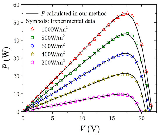 P-V characteristics measured and calculated, respectively, for the thin-film SM55 PV panel in different irradiance conditions.