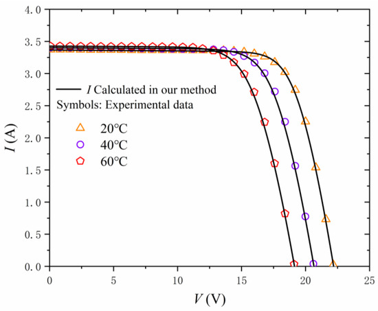 I-V characteristics measured and calculated, respectively, for the thin-film SM55 PV panel in different temperature conditions.