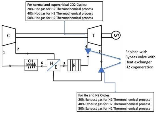 For the control system, a mix of inventory pressure control in the pipework and bypass control is proposed to enable steady power regulation during electricity and hydrogen production and complete diversion of the working fluid for hydrogen production, respectively, as the mass-flow rate is directly proportional to power with negligible effect on cycle efficiency. However, the recuperator and heat-exchanger effectiveness is considered an efficiency-limiting factor for hydrogen production and electricity generation. As such, the benefit of high-technology heat exchangers cannot be underestimated. This is also true when deciding on the thermochemical process to bolt onto the plant. The temperature of the gas at the end of the pipeline should also be considered to ensure that the minimum temperature requirement status for hydrogen production is met. The inlet temperature of the case studies is 950 °C or 750 °C. Therefore, with the assumption of a metal-plate heat exchanger with effectiveness of 0.8, the temperature at the end of the line would be above 500 °C, which is in the acceptable temperature range for some of the hydrogen-production cycles. A limiting factor for adopting a higher-temperature carbon dioxide (normal or supercritical) NPP cycle and working fluid would be materials. The cycle-material compatibility, including corrosion and oxidation of SCO2 with high-temperature materials (>750 °C), needs to be demonstrated. Helium as a working fluid also has its challenges, the main one being scarcity. Others include leakage through seals, turbomachinery tip leakages, and component welding. Nitrogen has more experience due to similarities to air, but its heat-transport properties are inferior to helium and SCO2, which would result in lower efficiencies.