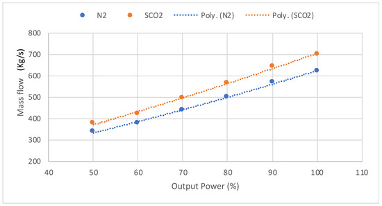 Mass-flow-rate demand of nitrogen and super-critical carbon dioxide cycles when producing electricity, between 100% and 50% power demand. The debited mass-flow rate is utilised for hydrogen production via a control valve as part of a system, which detects signals based on grid-power demand.