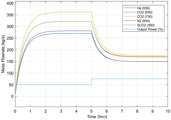 Control-valve response times (secs), with dynamic response and stability of mass-flow rates (kg/s) for the various working fluids. Note: SCO2 mass-flow rate for 950 °C is comparable to 750 °C flow-rate conditions.