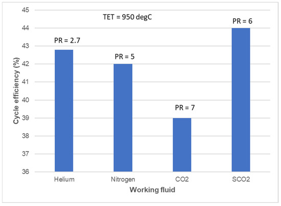 Figure 8, Figure 9 and Figure 10 provide some performance comparisons of the various working fluids. Helium cycle has lower system pressures and pressure ratios, which makes for a small power plant with the most turbomachinery stages. The SCO2 plant requires a high pressure ratio, thereby leading to a compact turbomachinery, but needs to be designed for high power density. There are also efficiency benefits of 43% and 44% for helium and SCO2 in comparison to Nitrogen and CO2 (see Figure 8).