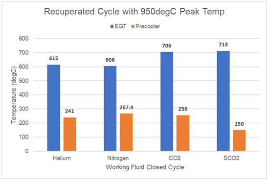Turbine-exhaust-gas temperature (EGT) and precooler temperature for a core-outlet temperature (COT) of 950 °C.