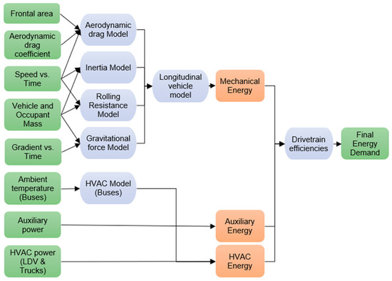 In the literature, many ways of modeling vehicle energy demand are reported. One of the most widely used is the longitudinal vehicle energy model. In this approach, the vehicle’s lateral and vertical dynamics are neglected, with the assumption that these do not significantly affect its energy demand [6]. A backward-looking model is used whereby the model starts with the traction energy required at the wheels to follow a driving cycle in order to determine the vehicle’s fuel energy demand [7].