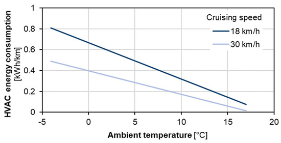 Ambient temperatures can affect the energy demand of vehicles through various mechanisms. The HVAC system for the passenger compartment is one of the major consumers. Fiori et al. (2016) consider the effects of auxiliary systems such as air conditioning and heating systems and demonstrate that the use of HVAC systems can reduce the EV range [8]. Abousleiman et al. (2015) model HVAC power requirements using a function that varies with the ambient temperature. According to this model, the power demand for cabin HVAC is negligible for ambient temperatures between approximately 14 and 27 °C [15]. In turn, Grube et al. (2018) utilized a simplified thermal model to determine the vehicle cabin’s HVAC energy requirements [18].