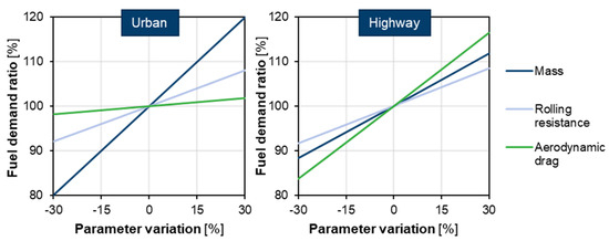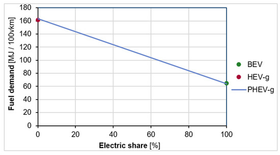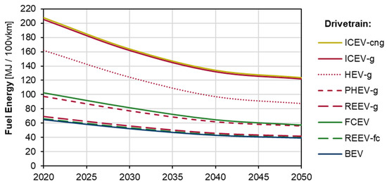 Table 2 shows all the different drivetrain efficiencies that are applicable for LDVs. Hybrid drivetrain efficiency is assumed to be 4% higher than its conventional counterpart [45]. Hybrid vehicles are divided into electric and conventional/fuel cell modes. In our model, efficiencies are assumed to be constant. This simplification was chosen to make the model more flexible regarding scenario calculations and sensitivity analyses. In reality, however, efficiency is a function of the powertrain’s load spectrum, which is specific for driving cycles and would also include the consideration of onboard auxiliary loads, such as air conditioning.