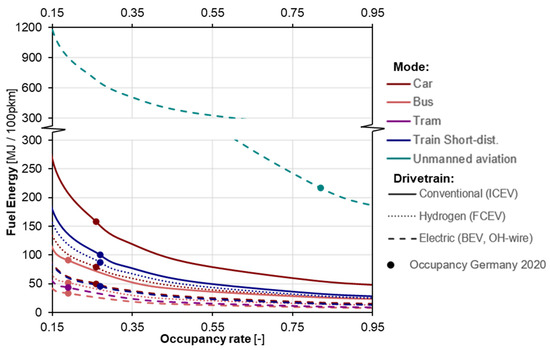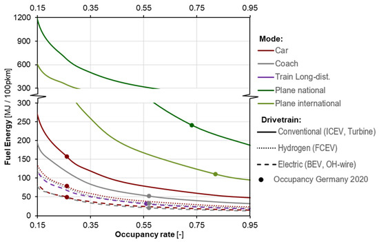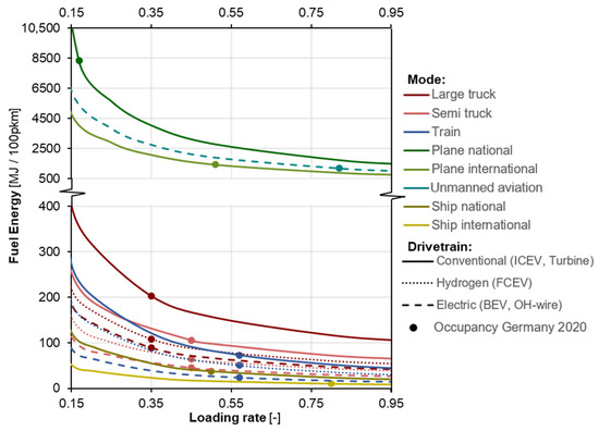 By including light-duty vehicles (LDVs), heavy-duty vehicles (HDVs), aviation modes as well as trains and ships, this paper goes beyond the status of model-based analyses presented in the literature. Moreover, the consideration of varying occupancy and loading rates, as well as the effects of driving conditions, simplifies comparative assessments of the energy demands of all relevant different transportation modes. This is particularly beneficial for projecting future energy demands across the entire transportation sector. The energetic comparison of different transport modes, including the influence of varying occupancy and loading rates, was not present in the literature and is the main outcome of this paper.