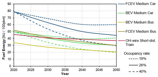 In future transport, the first aim should be to increase occupancy rates. This will be challenging to implement, but it is a free upgrade, as no additional technology investment is required to decrease the energy intensity of transport. Furthermore, the increased electrification of drivetrains will reduce the final energy demand for the transport sector.