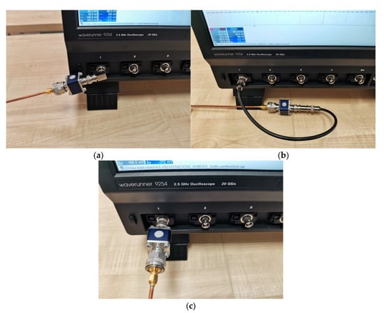 The condition for the correct integration of the signal is the preservation of time parameters of the signal and integrator. It should be remembered that the integration interval (0-t) should be shorter than the time constant τ = RC. This is a disadvantage of hardware methods, because the time parameters of the signal (field) being measured, must be known before the measurement. This makes it necessary to have a set of multiple integrators with different time constants ready when starting an experiment for which the frequency of the signal (field) is not known at all. The application of passive analogue integrators is relatively easy. Nevertheless, one should remember several practical aspects, which are already pointed out by the probe manufacturers themselves [17]. First, the integrator should be connected directly to the oscilloscope’s input without any additional connecting cables. This is shown in Figure 1c (recommended connection). Laying the lead wires, one should remember to avoid, as far as possible, any bends in the cable. Manufacturers of probes do not recommend using e.g., angled BNC connections. It is also probably dictated by the fact that in the case of bent connections it is difficult to maintain constant geometry of the circuit and consequently impedance parameters. It is especially important at high frequencies. It should also be kept in mind that correct integration results are easier to be obtained when the entire measurement path is at a common ground reference potential. Therefore, a semi-rigid cable is commonly used in this type of measurements. However, it is not recommended to use passive analogue integrators in a measurement system with the optolink connections. This is mainly due to the low voltage range of the optoelectronic circuit and noticeable noise deteriorating the measurement signal. In this case, one should use numerical integration directly in the oscilloscope or perform that stage in the post-processing activity.