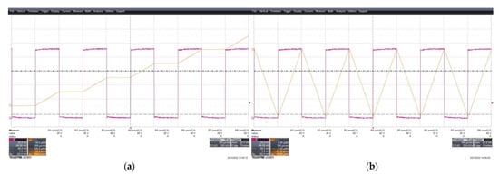 Rectangular waveform integration process, (a) signal non-zero mean value (purple), integral signal (yellow), (b) signal with mean value extracted (purple), integral signal (yellow).