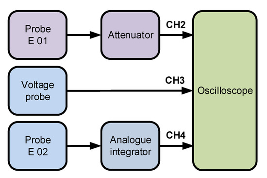 Laboratory setup for the electric field measurement. Probes E01 and E02—Montena SGE3-5G; Voltage probe—Tektronix P5100A; Attenuator—Montena attenuators: 10, 20, 30 dB, Analogue integrator: Montena ITR1-2U; Oscilloscope—LeCroy Waverunner 940Zi.