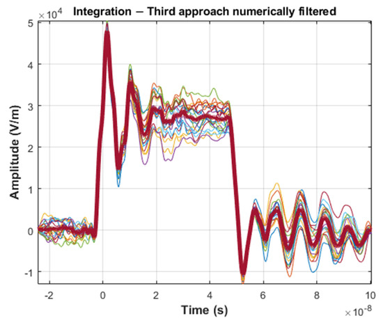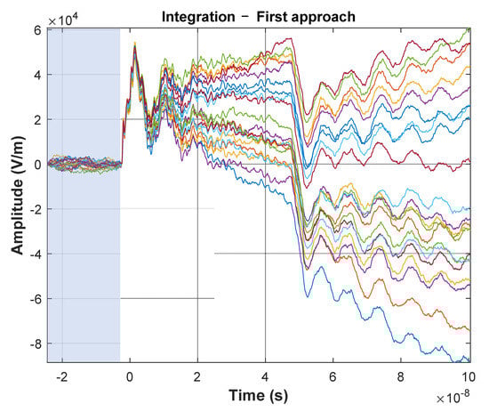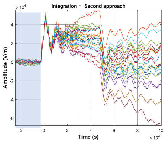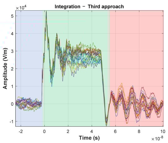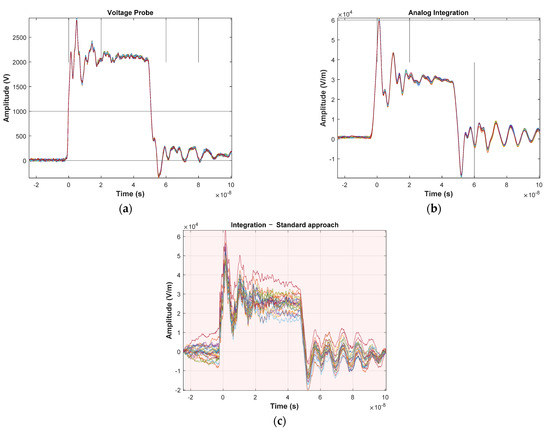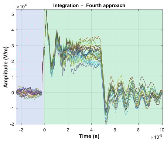 In Figure 5, one can see the high repeatability and stability of the signal pulses when measured with voltage probe and ground plane field probe with hardware integration (Figure 5a,b). Unfortunately, it cannot be observed (and consequently confirmed) in the numerical integration case (Figure 5c). It is due the high sensitivity of the numerical integration to the presence of a DC and very low frequency components in the input signal. At first, in the case of numerical integration, the average value required for the proper integration process was determined for the entire recording window (range marked in red). The effect of accumulation of constant values can be seen already in the initial phase of recording, before the actual triggering (t < 0), which results in the appearance, instead of a zero signal, of rising or falling waveforms. As a result, the voltage impulse itself, when analyzing the measurement series, is characterized by a very large dispersion. Interpretation of the results in this case is difficult and leads to significant, unacceptable results. For this reason, a number of experiments were carried out to eliminate the above-mentioned undesirable effects. The first experiment assumed, as in the case of numerical integration carried out on an oscilloscope, that the constant component does not change in the recording window. This time, however, the value was determined and subtracted from the raw input only on the basis of the recorded background signal before the triggering of the measurement system (t < 0)—Figure 6.