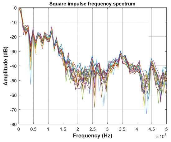 In order to meet the conditions of the experiment, another (fourth) approach of calculating the mean value was carried out. This time the mean value was calculated separately in pre-triggering and post-triggering intervals (Figure 9). The purpose of this test was to check how the introduction of computational simplifications would affect the final results. Though it represents much better performance compared to the first two cases, as it could be expected, the results obtained here are worse than in the third approach. The difference is especially visible in the intervals containing the rising and falling phases of the rectangular pulses. In all cases, the integration was also performed in the regions following the measurement signal. First of all, this activity made it possible to locate the end of the phenomenon, observe transients, and finally, possibly, detect wave phenomena. Summing up, the best results were achieved for the mean values calculated separately before, during and after the observed signal. Additionally in this case, the numerical low-pass filtration was carried out and the series of measurements were additionally averaged. Digital low-pass filtration parameters were selected upon the frequency spectrum of the measured square pulse signal (Figure 10) in order not to disturb the essential pulse properties. Duration of the observed pulses ranges within 50–55 ns. For this application, the low-pass filter cut off frequency was set to 400 MHz, which encompasses both a fundamental and significant number of harmonics. The obtained outcomes are presented in the Figure 11. Finally, a result very similar to the case with analogue integration was obtained. Therefore, a question can be asked about the advisability of all the above-mentioned measures. The answer is not complicated.