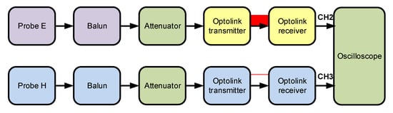 Measurement setup for the electric E and magnetic H fields. Probe E—Montena SGE3-5G; Probe H—Montena SGM2G; Balun—Montena BL3-5G; Optolink-Montena MOL3000 + FCLB100; Attenuator—Montena attenuators: 10, 20, 30 dB; Oscilloscope—LeCroy Waverunner 940Zi.