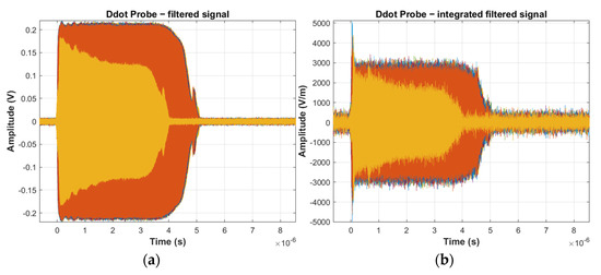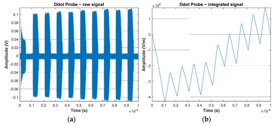 An example of electric field measurement signal, raw filtered signal from D-dot probe (a), integrated filtered signal from D-dot probe (b).