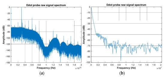 Electric field raw signal frequency spectrum, full bandwidth from 0 to 20 GHz (a), limited bandwidth 0 to 20 MHz (b).