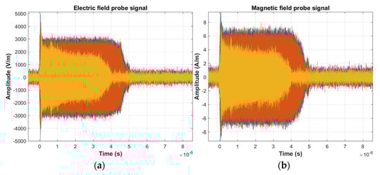 Based on the waveforms recorded in the measurement grounded circuits, high repeatability of the waveforms can be observed (Figure 5a,b). The effectiveness of the proposed and used integration methods can be evidenced by the measure of the scatter of values, containing the residual “constants” after integration. Based on Figure 5a,b, it is reasonable to conclude that the recorded waveform in the final phase has zero value. However, in the first approach to the implementation of integration (Figure 6), it can be observed that this is not the case at all. The scatter of the final values in this case varies from −83 kV/m to 60 kV/m, i.e., the rate of changes is at the level of 143 kV/m. In the second approach (Figure 7), the respective value is noticeably smaller, but still 104 kV/m. In the third and fourth approaches (Figure 8 and Figure 9), where the integration was performed segmented, these values are mutually comparable and reach only 0.3 kV/m, which proves high effectiveness of the applied modifications. The elimination of the trend in the integrated waveforms significantly facilitates or even enables a correct reading of the field parameters after integration.
