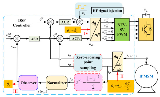 - Zhu, Z.Q.; Li, Y.; Bingham, M. Compensation for Rotor Position Estimation Error due to Cross-Coupling Magnetic Saturation in Signal Injection Based Sensorless Control of PM Brushless AC Motors. In Proceedings of the International Electric Machines & Drives Conference (IEMDC), Antalya, Turkey, 3–5 May 2007; pp. 208–213. [Google Scholar]