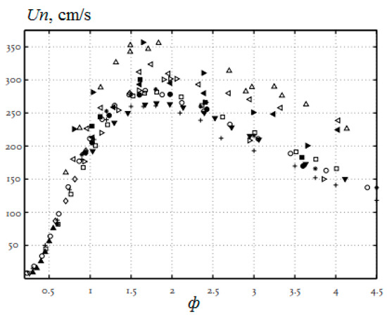 Dependence of the normal flame velocity Un of hydrogen–air mixtures on the equivalence ratio under normal conditions according to the results of various studies, which are represented by various symbols (Adapted from ref. [17]).