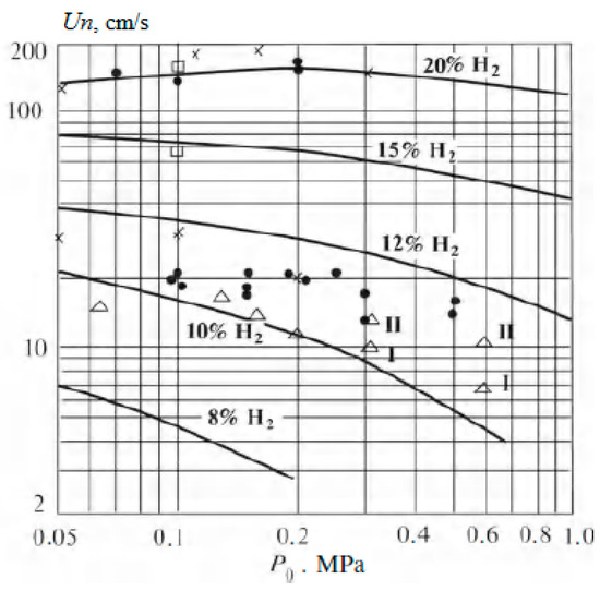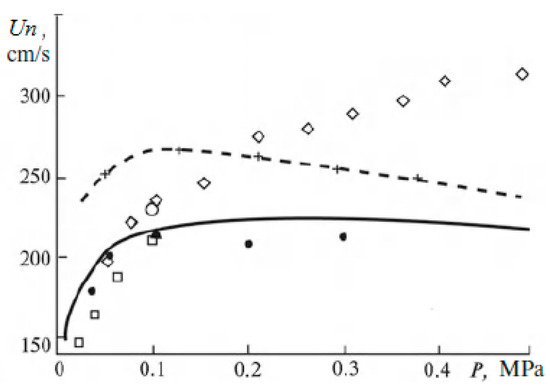 As for the influence of pressure on the normal flame velocity in mixtures containing hydrogen, then, as noted in [19], it is not always possible to determine it correctly in experiments. There are conflicting statements in the literature about the nature of the dependence of the normal flame velocity. When using different methods, sometimes even different signs of the baric index are obtained. This leads to large errors when extrapolating measured values to an unexplored pressure range. In the literature, at one time there was a rule that in mixtures with a flame velocity of more than 100 cm/s at atmospheric pressure, the combustion rate increases with pressure, and in mixtures with a flame velocity of 50 cm/s or less, the combustion rate decreases with pressure. However, it is stated in [19] that experimental material has now been accumulated that refutes this empirical rule for mixtures containing hydrogen. Experimental and calculated data are also given there, showing that with increasing pressure, the normal flame velocity does not decrease and even, under certain conditions, increases (Figure 2 and Figure 3).