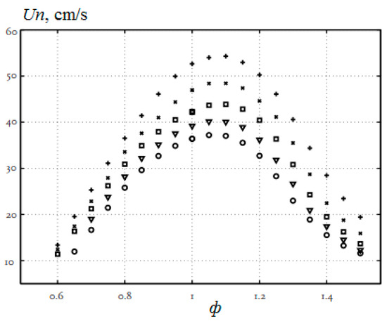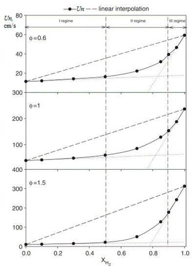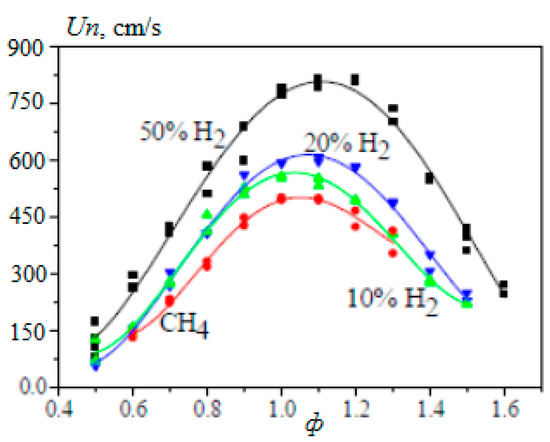 The dependence of the laminar flame velocity for methane–hydrogen–air mixtures under normal conditions on φ in the range of hydrogen concentrations from 0 to 100% was measured in [18] (Figure 7).