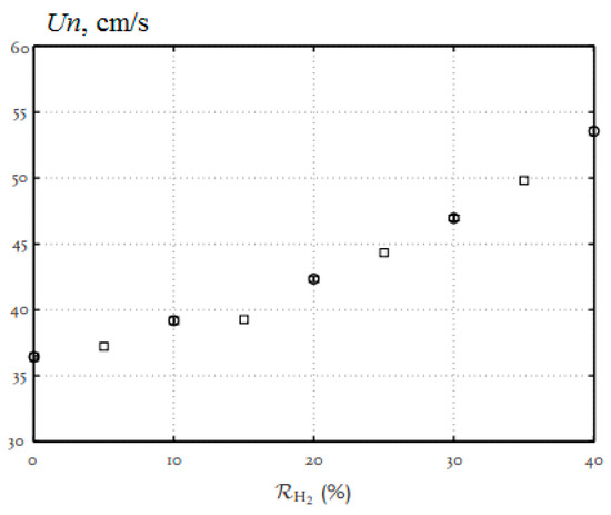 Thus, an increase in the hydrogen concentration in the range up to 40% leads to an almost linear increase in the normal flame velocity (Figure 5).