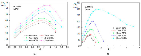 Dependence of the normal flame velocity Un for hydrogen–methane–air mixtures on the equivalence ratio φ under normal conditions for various hydrogen concentration [18]: (a) hydrogen concentrations 0–50% vol., (b) hydrogen concentrations 60–100% vol. (Adapted with permission from ref. [18], 2009, Elsevier.)