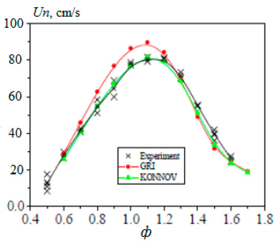 In [20], the experimentally obtained values of the normal velocity of the laminar flame of methane–hydrogen–air mixtures were compared with the values obtained by calculation. The simulation was carried out using two well-known kinetic mechanisms, GRI-Mech 3.0 [21] and Konnov [22], which showed good agreement with experimental results, especially for the Konnov mechanism (Figure 8).