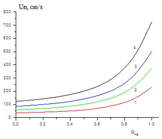 Calculated dependence of the laminar flame velocity on the hydrogen content αH2 at initial temperatures T0 (K): 300 (1), 400 (2), 500 (3), 600 (4) (Adapted with permission from ref. [25], Copyright 2019, TORUS PRESS.).