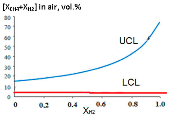 Dependence of the upper (UCL) and lower (LCL) concentration limits of flame propagation in air on the volume fraction of hydrogen in the methane–hydrogen mixture.