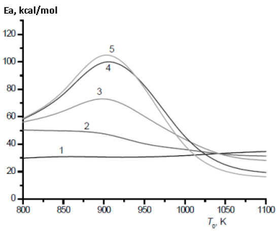 Calculated temperature dependence of the effective activation energy of the ignition delay time for stoichiometric mixtures CH4–H2–air (Ea, kcal/mol) on the initial temperature T0 at various values of the H2 concentration (%): 0 (1), 40 (2), 70 (3), 90 (4), 100 (5). P0 = 1 bar (Adapted with permission from ref. [30], Copyright 2018, OBRACADEMNAUKA.).