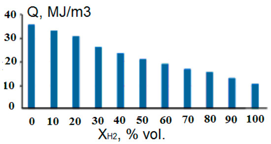 The development of hydrogen energy and the hydrogen market is constrained by the lack of economically viable technical solutions for a full-cycle hydrogen economy, including for transporting large volumes of hydrogen over long distances. A serious logistical problem is the lack of an appropriate infrastructure for the storage, transportation and distribution of industrially significant volumes of hydrogen [82], for the creation of which there are still no practically acceptable solutions. Most of the metals from which existing gas pipelines are made are subject to destruction under the influence of hydrogen diffusion in them, especially at high pressures. This imposes much more stringent requirements on the manufacture of pipelines for transporting hydrogen compared to pipelines for transporting natural gas [83] and dramatically increases their cost. Therefore, already existing gas pipelines cannot be used to transport hydrogen, and the cost of special pipelines will be many times higher than the existing ones. As a more practical, economically justified and technologically safe alternative, the possibility of transporting hydrogen through pipelines in the form of methane–hydrogen mixtures (MHM) is discussed. However, the significantly higher energy costs for hydrogen compression compared to natural gas [82] (Figure 15) and the lower volumetric energy content in such mixtures (Figure 16) raise the issue of the economic feasibility of such a hydrogen transportation system [12].