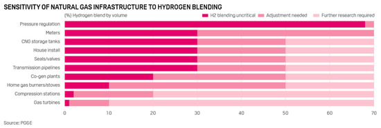 - Wojtowicz, R. An analysis of the effects of hydrogen addition to natural gas on the work of gas appliances. Naft. -Gaz 2019, 8, 465–473. [Google Scholar] [CrossRef]