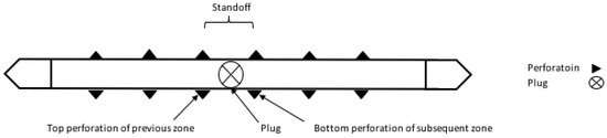 Net pressure and stress contrast both increase substantially with the number of sequential fractures and decreased fracture spacing [10]. Induced stress shadow from previously fractured stages also has effects on the subsequent zone as the effects extend beyond the top perforation and may thus change the fracture initiation at the next bottom perforation for the next stage [2]. Therefore, the standoff between the top perforation for one stage and the bottom perforation for the subsequent stage may affect treatment through stress shadow effects and will be included in the regression models. Figure 2 is a schematic of the perforation standoff in the wellbore. The hypothesis is that increasing the perforation standoff will decrease stress shadow effects from previous stages and thus decrease average STP.