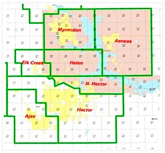 The summary and definitions for the data used for this study are shown in Table 1 and Table 2. Data was collected from four recently re-fractured wells in the Hector field in Dunn County North Dakota. The location of the field and the operator’s acreage are shown in Figure 3 [17]. Specific well locations and names were not allowed to be included. Figure 4 shows the location of the field in the larger context of North Dakota. The data only include 117 observations for perforation standoff and previous stage average STP, as the first stage of each well were excluded as they were not applicable. These were excluded from the regression models.